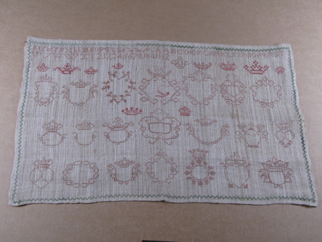 Deze doek is vrijwel alleen met kronen, wapenborden, schilden en harten gevuld. De naam van de borduurster is onbekend. Aan de bovenzijde van de doek heeft het vermoedelijk nog jonge meisje twee alfabetten geborduurd, één in gotisch schrift, het andere in Romeinse kapitalen. Daarop volgt een cijferreeks. De alfabetten worden geoefend om linnengoed te merken. Deze doek kan daarom een merklap genoemd worden, maar wel een atypische. De hoeveelheid omlijstingen is uitzonderlijk. Er is slechts één ander exemplaar bekend. De cijferreeks wijkt eveneens af. De meeste reeksen eindigen op een nul of op een tien, daarmee zijn alle cijfers geoefend. Deze reeks eindigt met een elf en een twaalf. De doek is vermoedelijk tussen 1775 en 1800 vervaardigd en meet 31 bij 51 cm. De borduurster heeft zijden garen gebruikt op los geweven linnen. Het aantal kleuren is beperkt gebleven. In de middelste cartouche op de eerste rij, is de aanzet van een initiaal te zien. Cartouches komen aan het einde van de achttiende eeuw in zwang. Ze hebben dezelfde functie als de bloemenkransen en de kronen en benadrukken het belang van de drager of draagster van de initialen, die zij omhullen. Het is ook mogelijk dat de doek gemaakt is door een meisje, dat later de linnenuitzet van voorname dames van monogrammen moest voorzien.