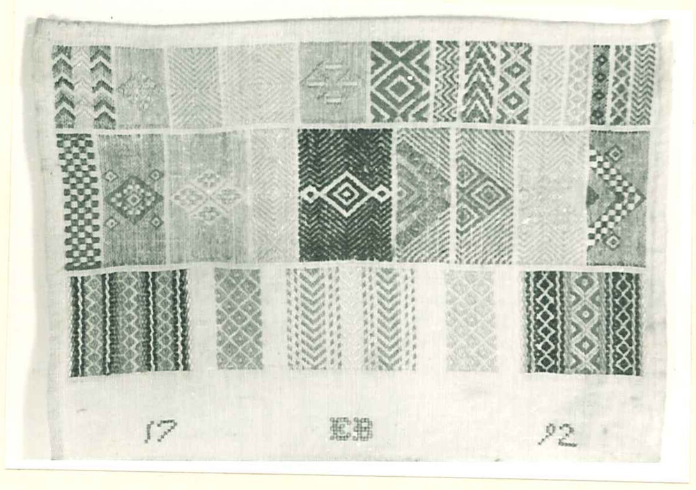 Dit is één van de drie doeken van een achttiende-eeuwse borduurster die de initialen EB draagt (KA 1024, KA 1028 en KA 1029). Haar werk is van hoge kwaliteit. Des te spijtiger is het dat haar naam onbekend is gebleven. Deze doek uit 1792 laat zien dat het jonge meisje zeer bedreven is in het doorstopwerk. Ze werkte heel secuur met zijden garen op katoen met een ingesponnen linneneffect in de stofdraad. Het is een klein werkje, dat slechts 15,5 bij 21 cm meet. Door de vele kleuren en technieken is het een lust voor het oog. De ‘leesrichting’ loopt naar alle waarschijnlijkheid in drie kolommen van boven naar beneden. Voor haar initialen aan de rechterzijde heeft ze de kastjessteek gebruikt, voor het jaartal enkel kruissteekjes. (Suzette van 't Hof)
