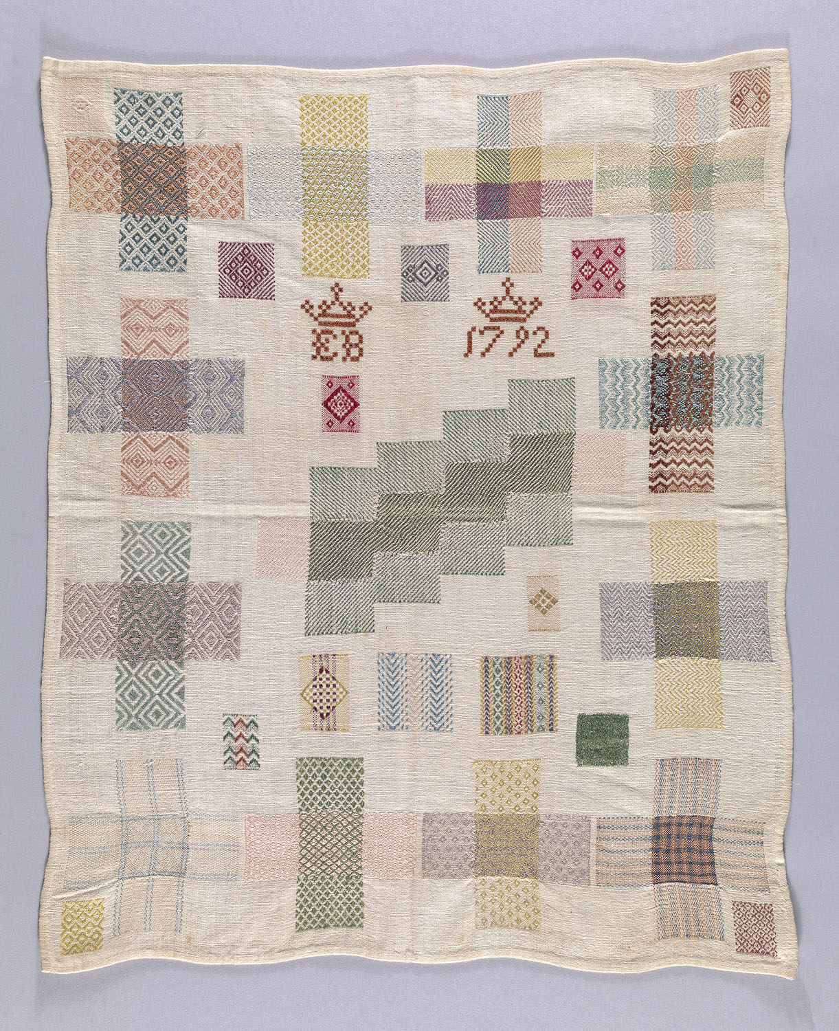 Dit is één van de drie doeken van een achttiende-eeuwse borduurster die de initialen EB draagt (KA 1024, KA 1028 en KA 1029). Haar werk is van uitzonderlijk hoge kwaliteit. Des te spijtiger is het dat haar naam onbekend is gebleven. Deze doek uit 1792 getuigt van een knap staaltje doorstop- en stopwerk. Dat de jonge borduurster angst voor lege ruimten lijkt te hebben bewijzen alle drie de doeken, die aan haar toegeschreven zijn. Deze stoplap is rijk gevuld, met grote en kleine stoppen. Er is amper ruimte voor haar gekroonde initialen en het jaartal waarin de doek vervaardigd is. Ze werkte met zijden garen op katoen met een ingesponnen linneneffect in de stofdraad. De doek meet 46 bij 38 cm. Ze heeft voor rustige kleuren gekozen waarbij groen- en bruintinten en donkerrood de boventoon voeren. (Suzette van 't Hof)