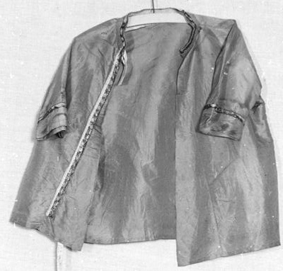 Jasje van lichtblauwe zijde, korte mouwen en geen sluiting. gegarneerd met galon. Het jasje is vermoedelijk gemaakt uit de onderkant van rok KA 1071.2. Het is mogelijk als verkleedkostuum gemaakt, vermoedelijk rond 1910, als een Chinees jasje. Het was toen erg in de mode om zich te verkleden in Aziatische kleding als verkleedkostuum.- Trefwoorden