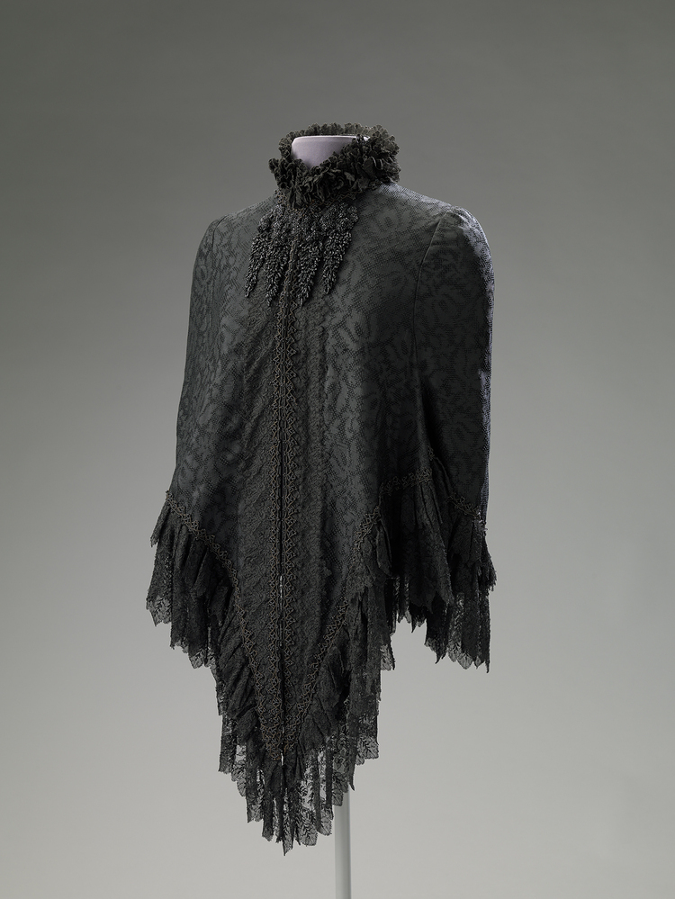 Mantelet van zwarte open geweven stof met bloemmotief. De hals en randen zijn versierd met zwart kralenband. Bij de hals en onderaan de rug een zwart kralen ornament. De zoom is afgezet met twee aangerimpelde en geplooide stroken machinaal kant. Sluiting middenvoor met zeven metalen haken en ogen.