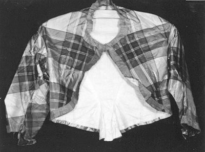 Japonlijfje in de vorm van een bolero van blauw en groen geruite taftzijde met pagode mouwen. Waarschijnlijk hoorde er bij dit japonlijfje een bijpassende rok en avondlijfje in dezelfde stof. Openvallende korte lijfjes komen vanaf circa 1852 in de mode. Eronder werd een blouse gedragen. De mouwen lopen vanaf circa 1851 steeds verder trechtervormig uit. Ruiten zijn in de jaren 1850 en 1860 in de mode.