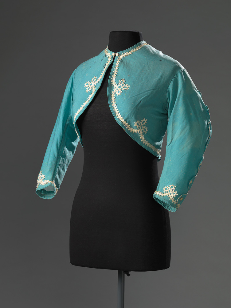Blauw jasje van kasjmier wol versierd met witte soutache. Geschulpte garnering met knoopjes aan de mouw. Sluiting middenvoor bovenaan bij de hals.