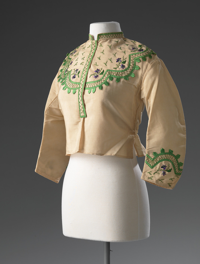 Jasje van beige stof is geborduurd met strooipatroon van viooltjes in paars en groen, afgezet met groen lint.- Trefwoorden
