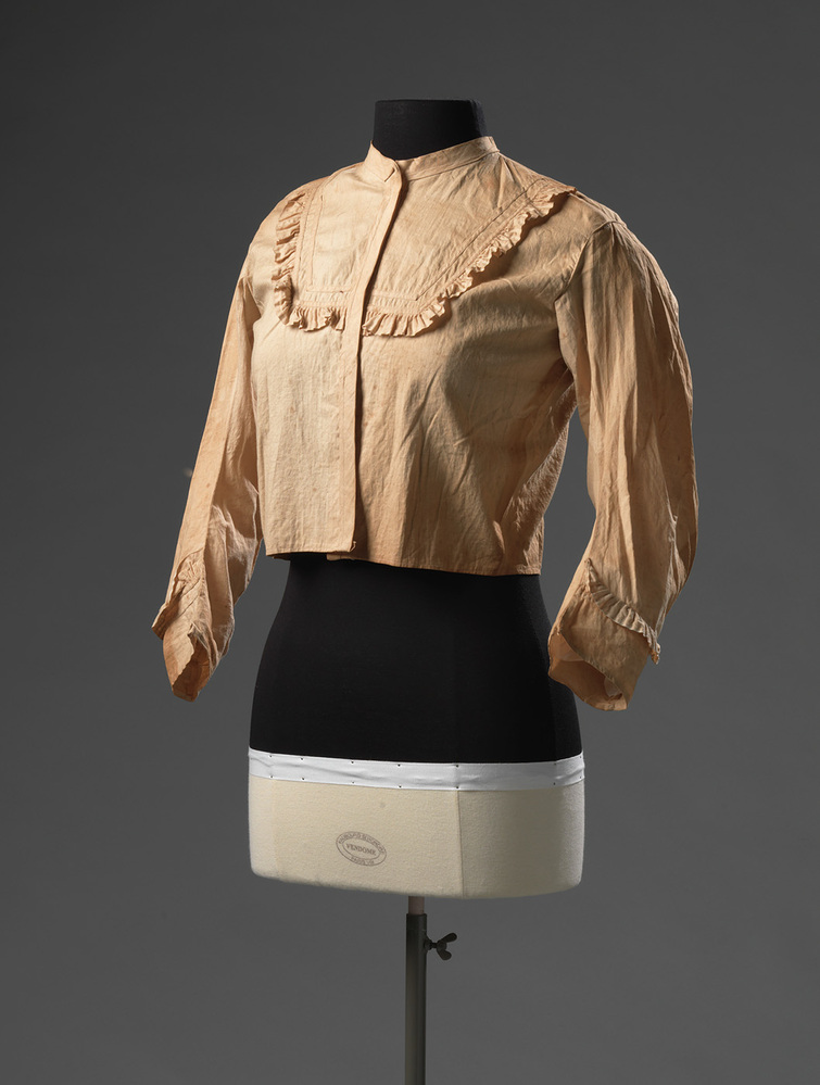 Een blouse als deze werd als vroege sportkleding gedragen, bijvoorbeeld voor het wandelen of een potje tennis. De blouse werd gedragen met een rok eronder en een bolero over de blouse.