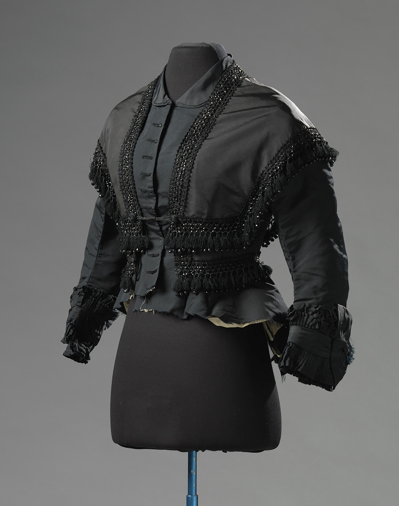 Zwarte bolero van ripszijde met galon van zwarte zijden franje, kwastjes en kraaltjes, sluit van voren met een koord. De stof niet niet hetzelfde als die van het lijfje. De bolero past in de mode rond 1865-1870, en werd over een crinoline japon gedragen.