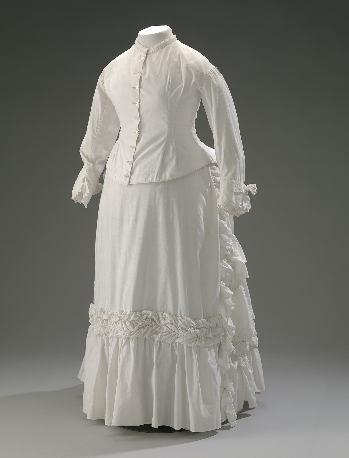Japon, driedelig, wit katoen versierd met broderie Anglaise, bestaande uit een jasje, rok en halve overrok, ongevoerd. Goed voorbeeld van de eerste tournure: afhangend, creërt met de draperieën aan de achterkant van de japon een ' watervaleffect' (tot 1875). Het nauwsluitende jasje met schootpandjes heeft een ronde hals en lange, rechte mouwen. Strik van katoen aan de onderkant van de mouw en eindigend met een licht gerimpelde strook broderie anglaise. Sluiting middenvoor door middel van knoop en knoopsgaten. Rok is wijd en heeft een sleepje. Alle ruimte is door middel van draperieën, oprijgsels en aangerimpelde stroken naar de achterkant gebracht (om over de tournure te vallen). Losse halve overrok met een zak waarop met een strik.