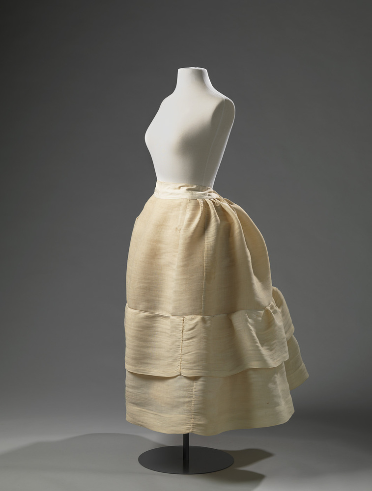 Onderrok of crinoline van crèmekleurige stof verstevigd met ingeweven paardenhaar. Aan de onderkant twee brede stroken. De voorkant is glad aangezet, de zij- en achterkant zijn geplooid aangezet aan een witte katoenen tailleband.