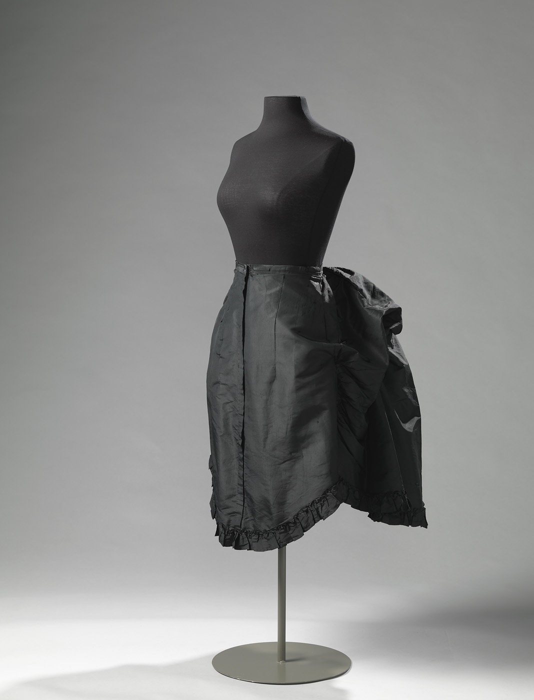 Modieuze zwarte draperie van ripszijde met een strookje langs de onderzijde. De achterzijde van de draperie viel op de tournure. De draperie is rond van oplopend, dit past in het modebeeld tussen 1870 en 1875. De draperie werd gedragen met een japon van dezelfde stof. Deze japon bevindt zich niet in de collectie.