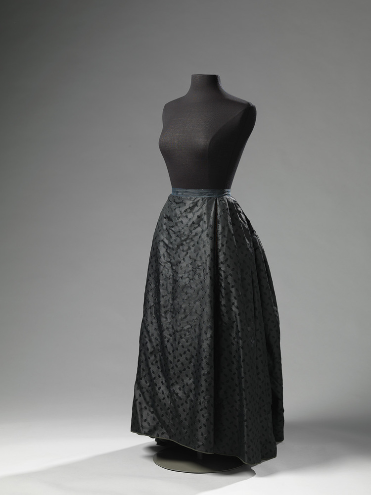Rok van zwarte zijde met ingeweven bladmotief, wijd model, van voren glad, zij- en achterkant met kleine plooitjes vastgezet op een tailleband, achter uitlopend in een klein sleepje. De zoom is afgewerkt met een wollen bandje. Er bevindt zich geen bijpassend lijfje in de collectie.