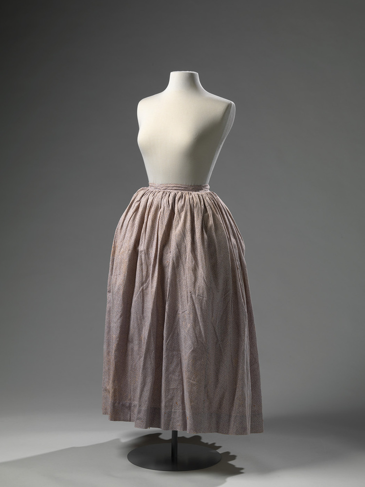 Rok van lila gespikkeld katoen. Langs de tailleband rondom met harmonicaplooien geplooid. De gebruikte stof was populair voor werkkleding en burgerkleding. De twee zakken langs de zijdes duiden op werkkleding. De rechterzak is ooit uitgescheurd en er later weer ingezet.