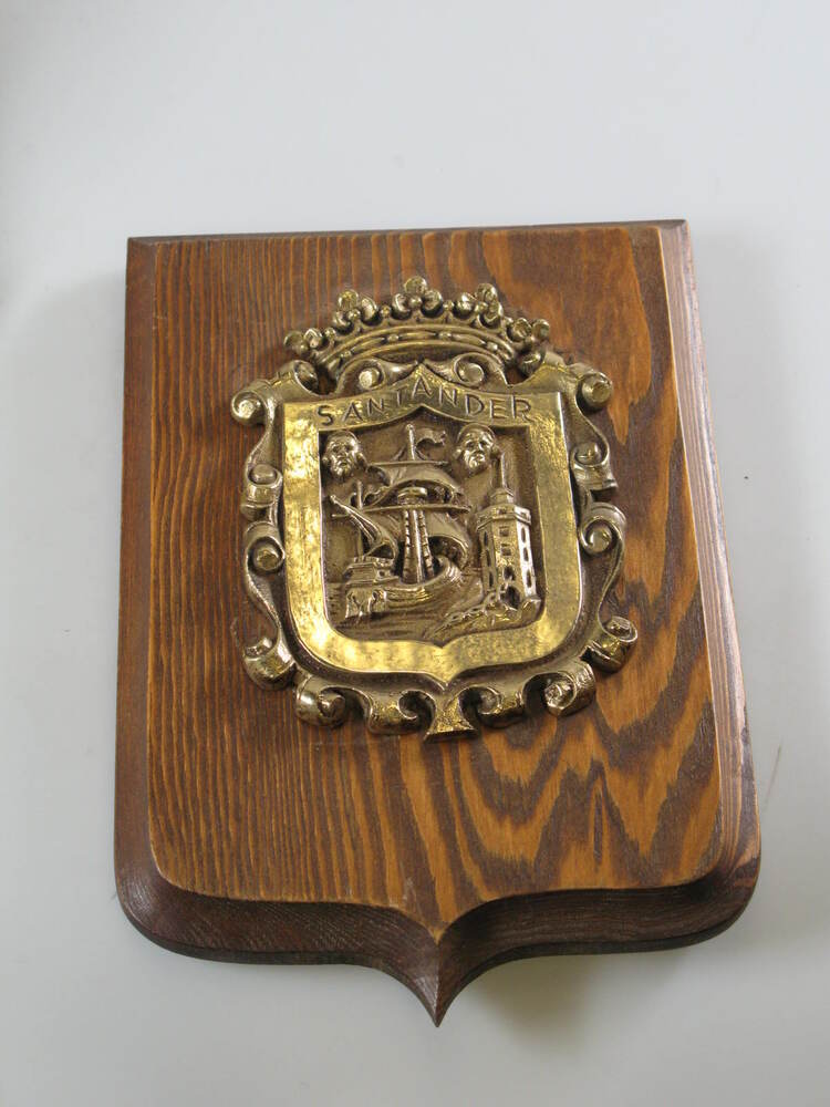 Houten schild waarop messing plaat bevestigd in vorm van stadswapen met zeilschip en vuurtoren en bovenop een kroon, opschrift: SANTANDER.- Trefwoorden