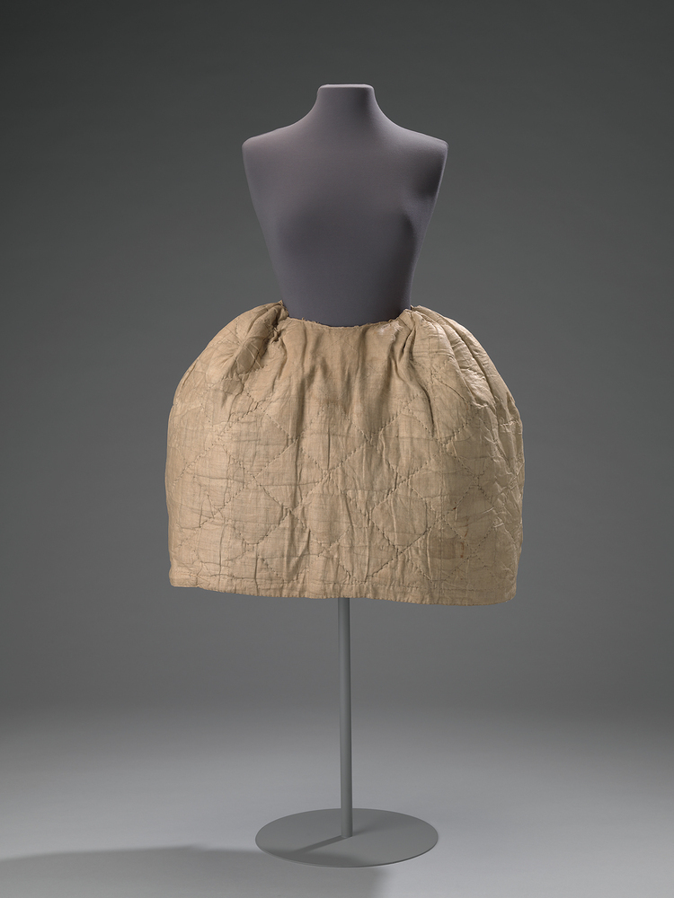 Panier van crèmekleurig linnen gewatteerd in een ruitmotief. De panier ofwel halflange onderrok is in de taille in te halen middels twee strikbanden. Op heupniveau ontbreken twee strikbanden. De zaksplitten zijn aan weerszijden extra opgevuld met paardenhaar. Zeer waarschijnlijk werd de panier middenachter gesloten. Aan weerszijden van de sluiting twee gladde vierkanten banen die opgevuld waren met paardenhaar en papier.