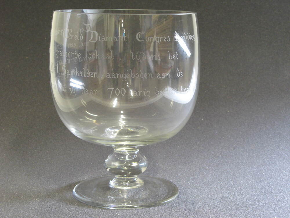Gravering: Ter gelegenheid van het 18e Wereld Diamant Congres werd deze met een diamant splinter gegraveerde bokaal, tijdens het burgermeesterschap van Dr. I. Samkalden, aangeboden aan de stad Amsterdam in het jaar dat zij haar 700-jarig bestaan herdenkt.- Trefwoorden
