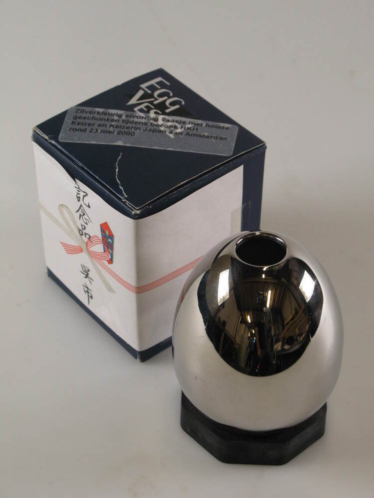 Spiegelend eivormig vaasje (1) op rubberen standaard (2), in kartonnen doos met tekst in zilveren opdruk: EGG/ VESSEL (3). Op zijkant van doosje is met plakband stuk papier bevestigd waarop in zwart Japanse karakters zijn gecalligrafeerd.