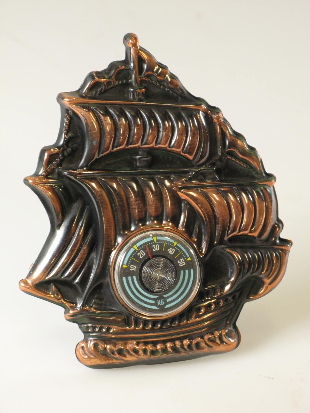 Rond thermometertje in koperen reliëf van zeilschip gelijmd.- Trefwoorden