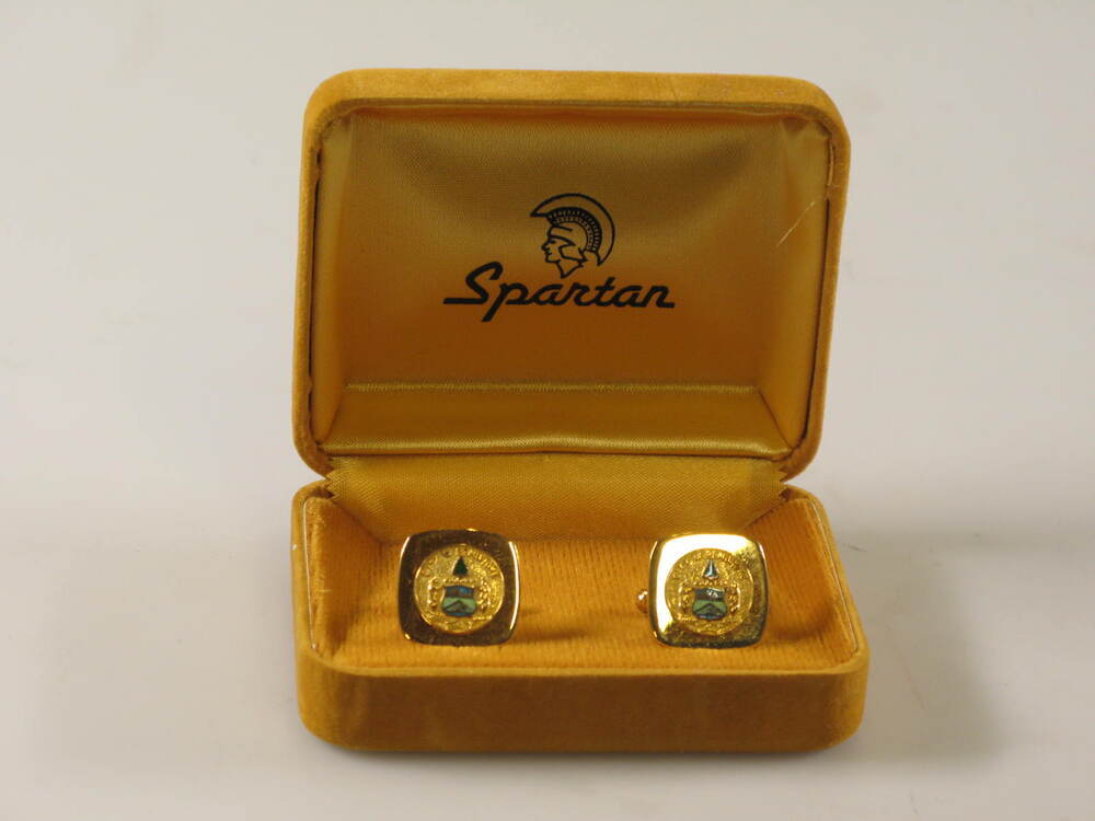 Messing manchetknopen met stadswapen van Pembroke (1-2), in zandkleurig doosje (3).- Trefwoorden