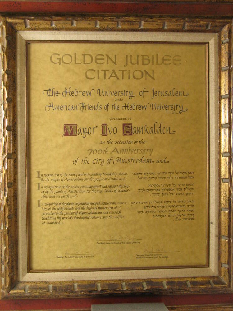 - Oorkonde voor Ivo Samkalden ter gelegenheid van het 700-jarig bestaan van Amsterdam, gegeven door de Hebrew University of Jerusalem en de American Friends of the Hebrew University, 1975