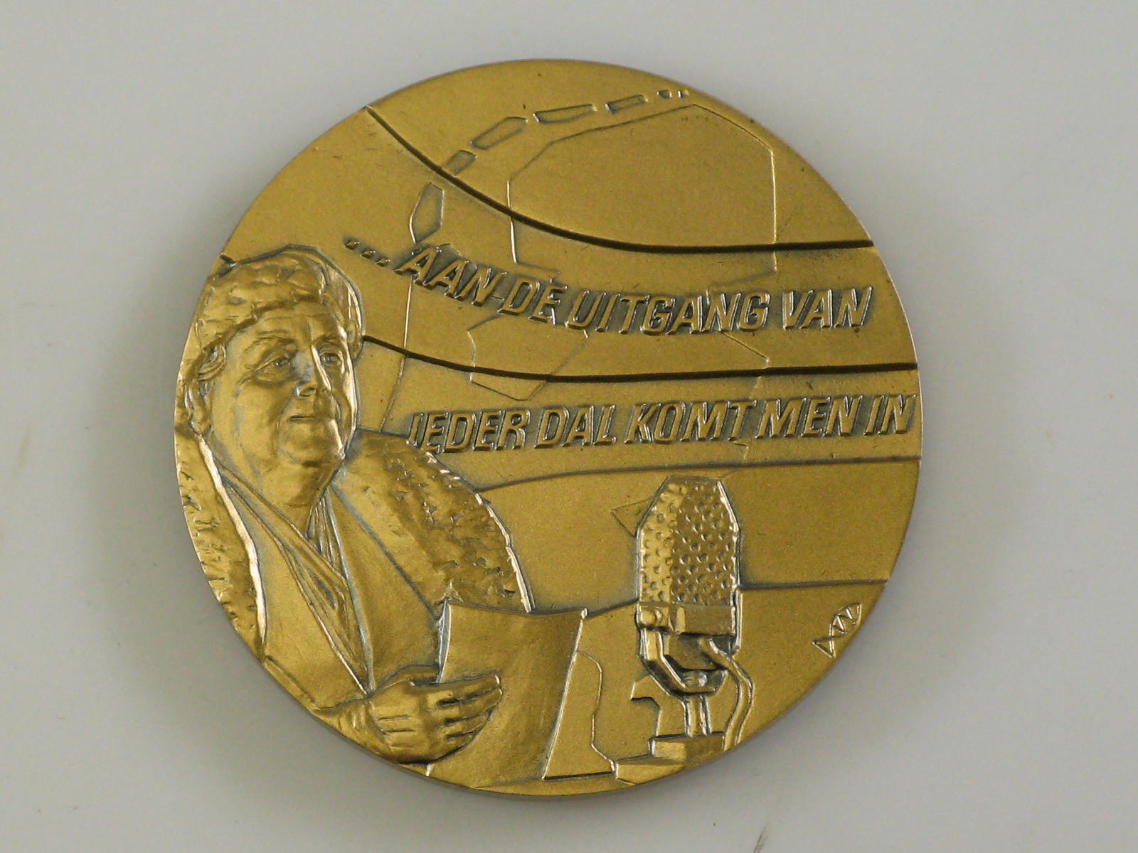 - tekst voorzijde: Aan de uitgang van ieder dal komt men in de ruimte en in het licht: Uitspraak van koningin Wilhelmina op 10 mei 1944 via Radio Oranje.
