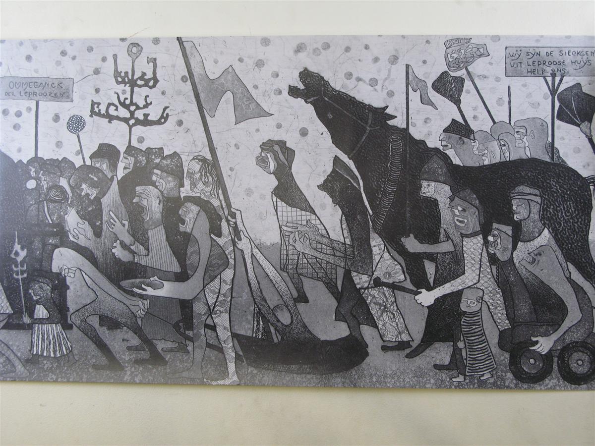 De uit Zeeland afkomstige Harry van Kruiningen, pseudoniem van Henri Adelbert Janssen, genoot zijn opleiding aan de Kunstnijverheidsschool te Amsterdam. Zijn vroege werk bestond uit tekeningen en schilderijen. Later legde hij zich toe op grafisch werk, waarvan hij zichzelf de technieken aanleerde. Van Kruiningen vatte al jong een liefde voor het socialisme op, dat onder meer tot uiting kwam in lidmaatschap van de communistische partij en het maken van politiek getinte tekeningen voor allerlei kranten. Zijn schilderijen zijn echter vooral stadsgezichten, die het stadsbeeld van de jaren dertig op realistische wijze documenteren. Op dit affiche heeft Van Kruiningen de zieken uit het Amsterdamse Leprozenhuis afgebeeld. Het Leprozenhuis lag op de hoek van de Lazarussteeg en de Jodenbreestraat, waar nu het Mr. Visserplein ligt. Het lag oorspronkelijk buiten de stadsmuren, vanwege zijn functie als gasthuis voor leprozen (lepralijders of melaatsen). ( Sarah Remmerts de Vries)