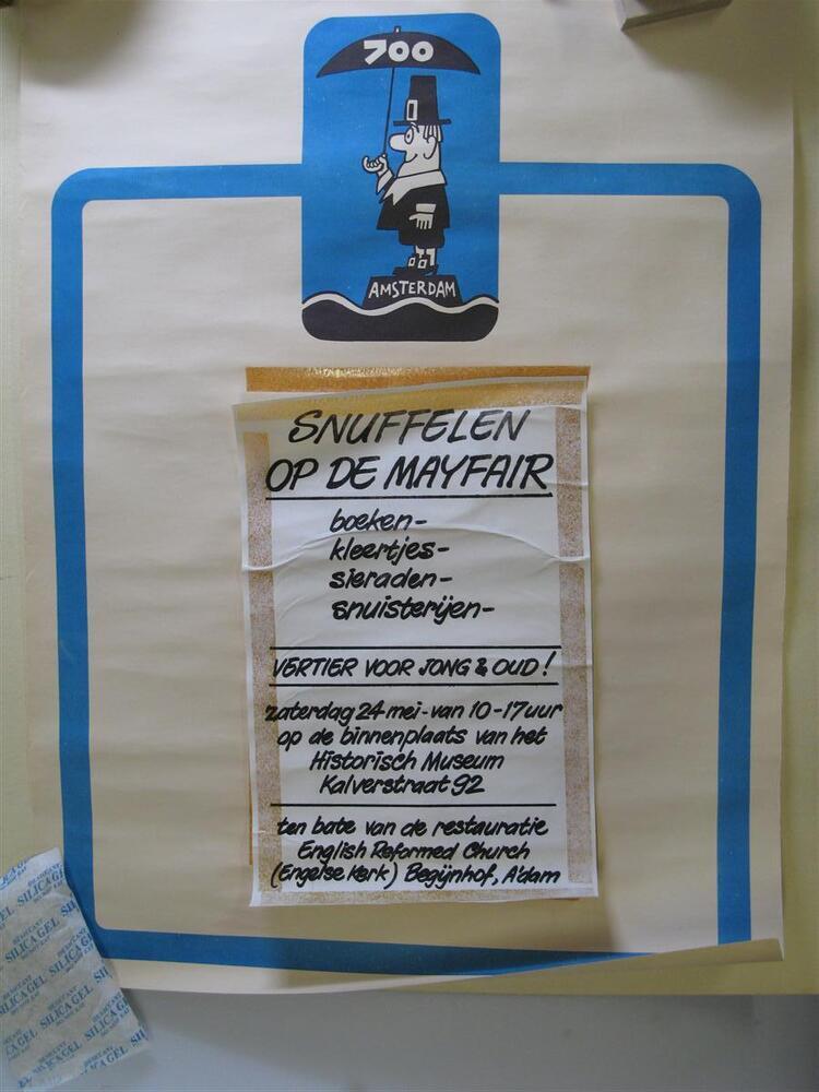 Affiche Amsterdam 700, met plakband is vel op affiche geplakt (losgekomen), met tekst: "Snuffelen op de Mayfair, zaterdag 24 mei op de binnenplaats van het Historisch Museum, ten bate van de restauratie English Reformed Church, Begijnhof, A'dam."- Trefwoorden