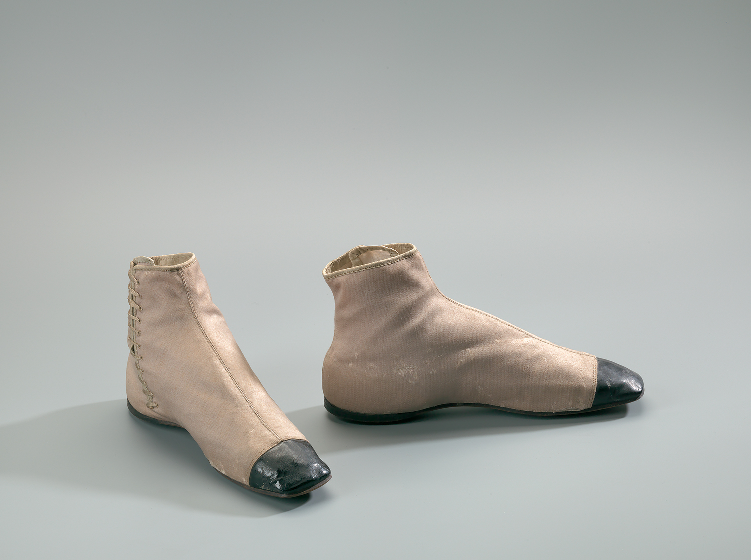 Rijglaars van licht grijsbruine wol en zwarte leren neus. Enkelhoog model met lange, vierkante neus en zeer lage hak. Vanaf de bovenkant tot aan het leren gedeelte op de neus loopt een lange naad. De schoen sluit door middel van een rijgsluiting die die aan de zijkant van de enkel loopt, met tweeëntwintig oogjes en een ecrukleurige zijden veter. Langs de bovenzijde en de opening loopt een groene zijden bies. De tong achter de vetersluiting is van licht grijsbruine wol en afgezet met idem bies. Zool van bruin leer. De schoenen zijn met ecrukleurig linnen gevoerd.