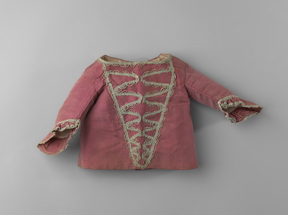 Babyjak voor een meisje van paarse ripszijde, langs de hals en mouwstroken en middenvoor in de vorm van een borstlap met grijs galon. Sluiting op de rug om het jakje te sluiten met drie banden. Voering van licht linnen. Bijzonder jakje, met engachangtes en borstlap.
