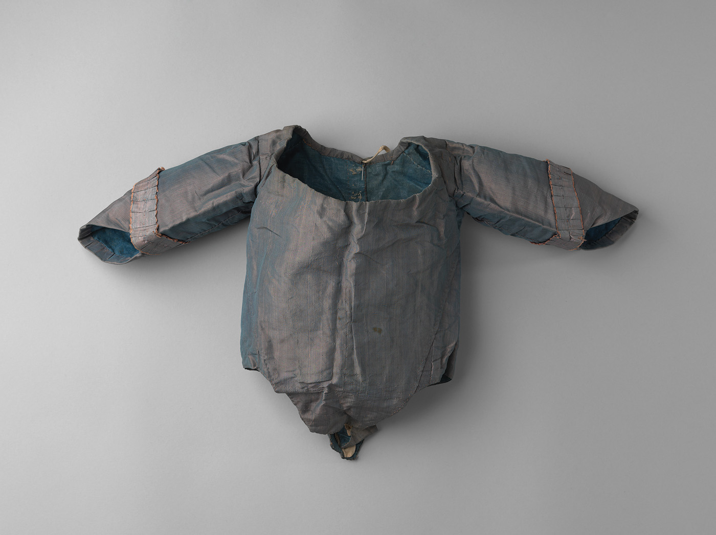 Japonlijfje voor een meisje van blauw changeant tafzijde, voor en achter in een punt uitlopend, aan de mouw een geplooide strook. Voering van blauw linnen. Aan de binnenzijde in de punt een extra vakje om het keuslijfe te doen zodat het op zijn plek bleef. Aan de achterzijde op de punten een lus om aan het keurslijfje te spelden. Langs de hals een koord om het lijfje in te halen. Sluiting achter met haken en ogen die nu gedeeltelijk ontbreken.