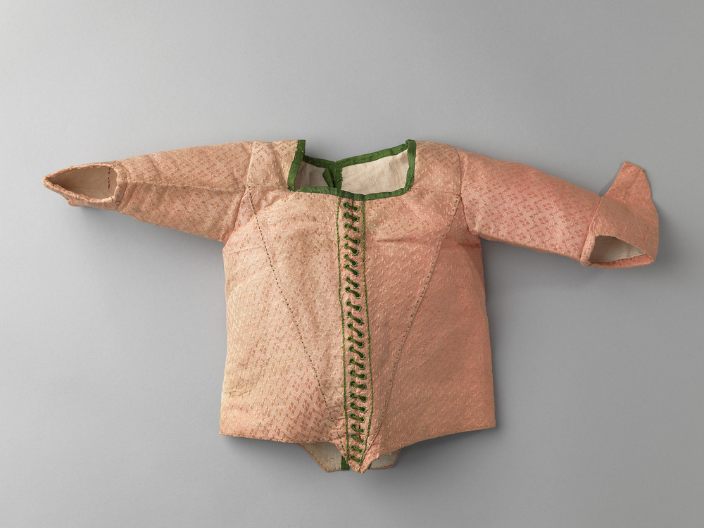 Babyjak voor een meisje van ingeweven roze zijde met kleine ruitjes. Het lijfje loopt middenvoor in een punt. Versiering van groene zijden veter door geborduurde gaatjes, afgezet met groen lint. Voering van wit linnen. Sluiting middenachter met groen lint. Langs de mouwen varkensoren, waarvan een mouw er nu scheef is ingezet zodat de mouwen niet gelijk zijn. Wanneer dit is gebeurd is onduidelijk.
