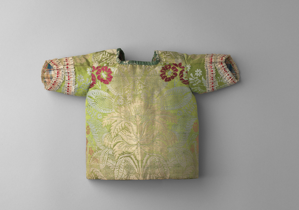 Babyjak van groene zijde damast met groot gebrocheerd bloempatroon in roze, grijs en rood. Aan de mouwtjes wit lint met rode bloementjes. Voering van geruit linnen. Langs de halslijn afgezet band van groene damast (andere stof). De mouwen afgezet met twee ruches van band, het zelfde band als bij de sluiting op de rug. Bijzonder jak.
