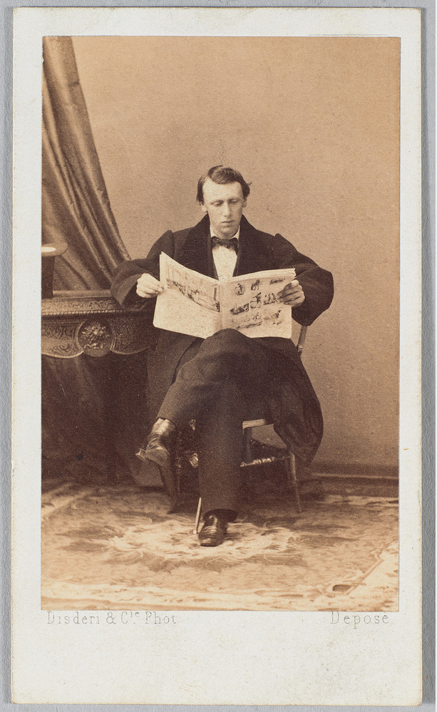 Kroonprins Willem (1840-1879), roepnaam ‘Wiwill’, was de oudste zoon van koning Willem III en koningin Sophie. De relatie met zijn vader was zo slecht dat de prins in vrijwillige ballingschap in Parijs ging. Hij stortte zich in het uitgaansleven en stierf jong. De foto van Disdéri – de ‘uitvinder’ van de carte de visite en hoffotograaf van Napoleon III - toont Willem in een ongedwongen pose terwijl hij een geïllustreerd magazijn inziet. Het Rijksprentenkabinet in Amsterdam bezit een onversneden vel met acht portretten van de prins die tijdens dezelfde poseersessie zijn gemaakt. ( Bert Vreeken)