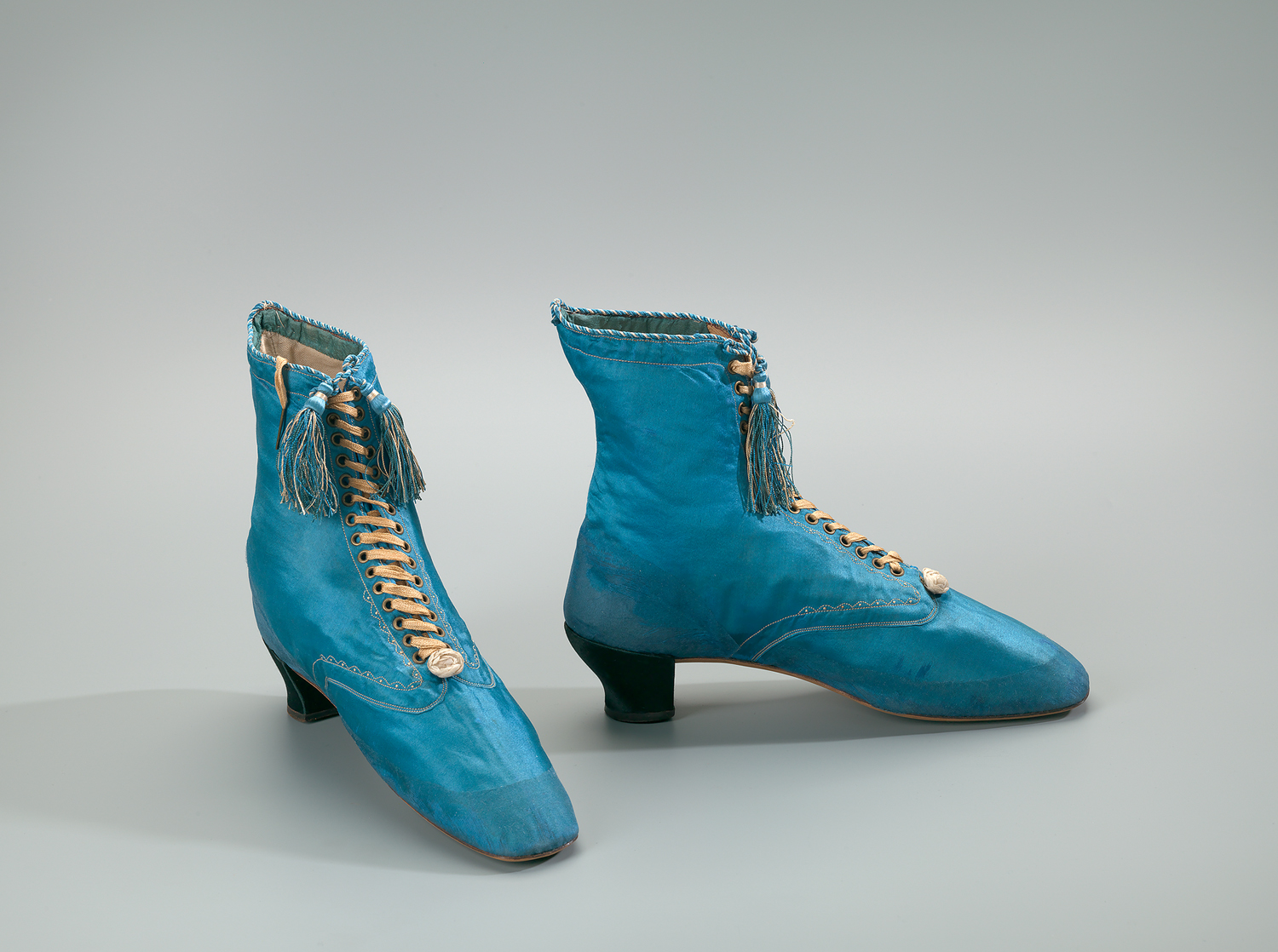 Rijglaars (rechts) van blauw zijde satijn afgezet met koord galon. Enkelhoog model met taps toelopende neus en hak. De opening van de laars is afgezet met een gedraaid koord van blauwe en beige zijde, met aan beide uiteinden een kwastje. Middenvoor een vetersluiting met metalen oogjes en een beige zijden veter. Langs de bovenkant en de vetersluiting een beige sierstiksel. Onderaan de vetersluiting is de laars versierd met een opgestikt roosje van ivoorkleurige zijde. De laars heeft een bruine lederen zool en de hak is bekleed met zwart satijn. Aan de binnenzijde langs de bovenrand is een blauwgroene zijden bandje opgestikt. De laars is gevoerd met beige keperkatoen, en de flap met beige zijde. De binnenzool is van zeemleer.