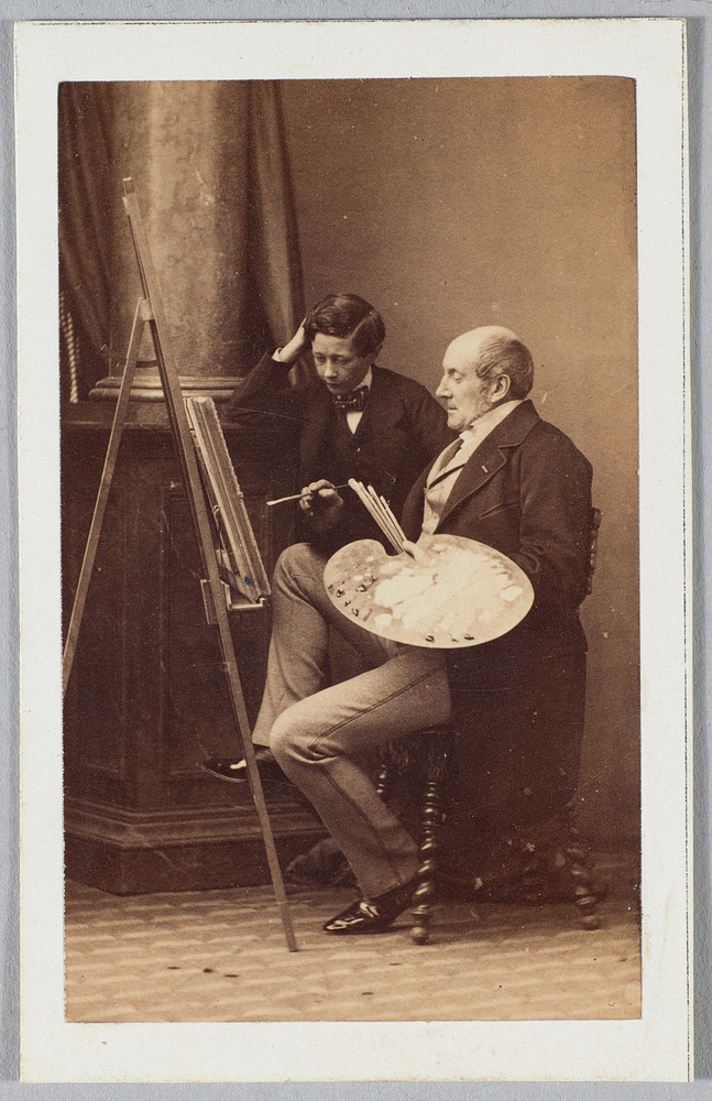 Louis Jadin (1805-1882) genoot vooral bekendheid als schilder van jachttaferelen en de honden van de Parijse beau monde. Disdéri’s enscenering met schildersezel en palet laat geen twijfel bestaan over de professie van de geportretteerde. Dat komt weinig voor, meestal geven pose en aankleding van de set geen aanwijzing omtrent het beroep. De identiteit van de aandachtig toekijkende jongeman is niet bekend. ( Bert Vreeken)