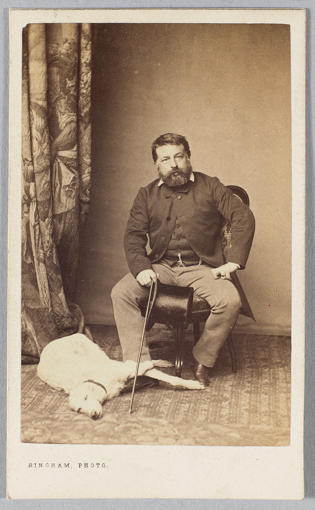 Ernest Meissonier (1815-1891) was de schilder van Napoleon III en diens wapenfeiten en daarmee een van de best betaalde kunstenaars van zijn tijd. Hij poseert hier niet in een standaard carte de visite houding. Het is een informeel portret, ondanks de aanwezigheid van wandelstok en hoge hoed. Meissonier zit wijdbeens en kijkt recht in de lens van de fotograaf. Zijn witte hond ligt loom aan zijn voeten. ( Bert Vreeken)