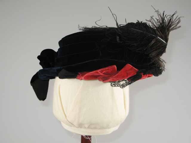 Hoed van blauw zwart fluweel, platte bol met omhooggeslagen kleine rand met rood fluweel gevoerd, zwart kant, ovale gesp. Bol gegarneerd met zwarte struisvogel veertjes, en strik die van achteren afhangt.