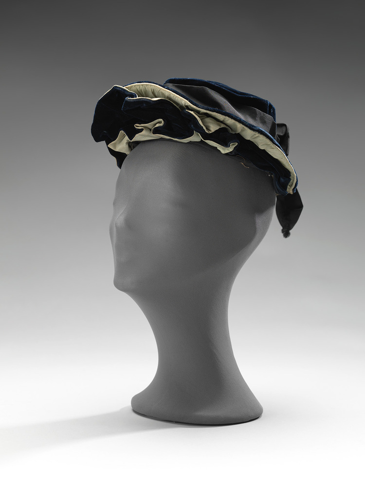 Hoed voor een vrouw met platte bol en rand, donkerblauw fluweel, zwart ripslint eindigend in strik. Onderkant resedagroen. Gerimpelde strook onder rand. Zijden binnenvoering.