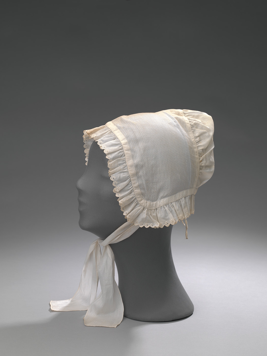 Witte katoenen nachtmuts met ingeweven streep, ingerimpelde rand en twee banden om onder de kin te strikken. Initialen in rood: SAS 12. Zie ook KA 1257.