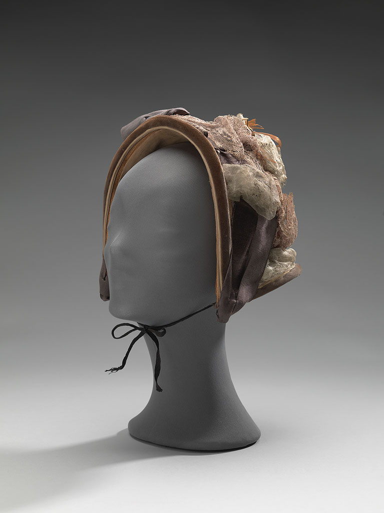 Hoed van geel stro, met grijs fluwelen rand. Over de bol ligt lila kant en grijs gaas met figuurtjes en bloempjes, op grijs geribd lint vastgehecht. Bijbehorende strik met lange linten. De linten zijn er verkeerd om opgezet.