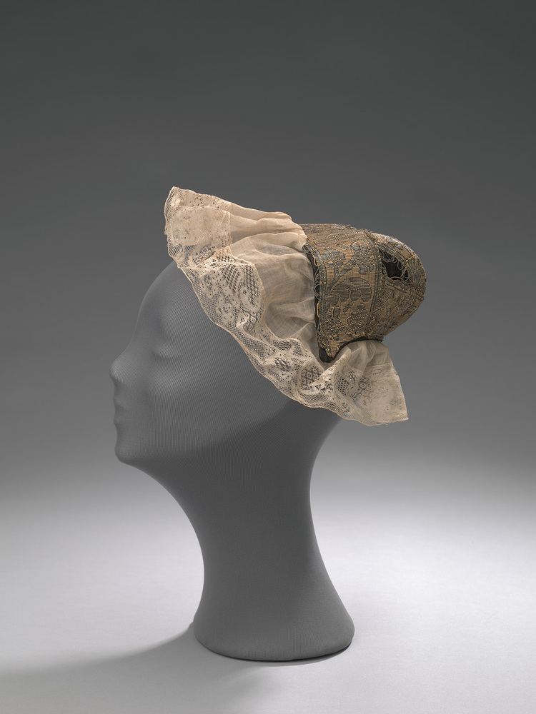 Goldhaube. Duitse streekdracht muts voor een vrouw. Met voering van gedrukt katoen die te dateren is rond 1820-1830.- Trefwoorden