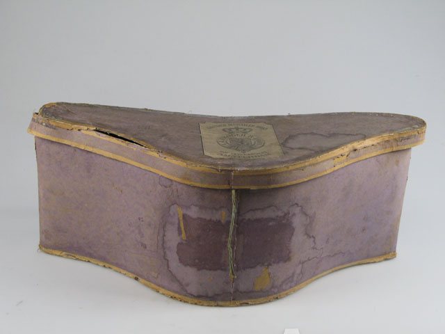 Kartonnen paarse doos behorende bij steek met kokarde en torsade