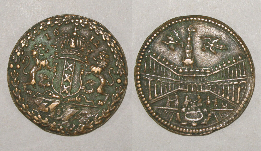 voorzijde: gekroond wapenschild van Amsterdam, geflankeerd door twee leeuwen onder het jaartal 1612; onder de afsnede een nummer. De rand is voorzien van een palmkrans.