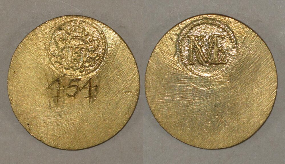 voorzijde: stempel in cirkelvorm met parelcirkel, waarin afgebeeld het gekroonde wapen van Amsterdam, geflankeerd door twee leeuwen, boven het gegraveerde nummer 454. keerzijde: cirkelvormig stempel met monogram MKRLS in parelcirkel.- Trefwoorden