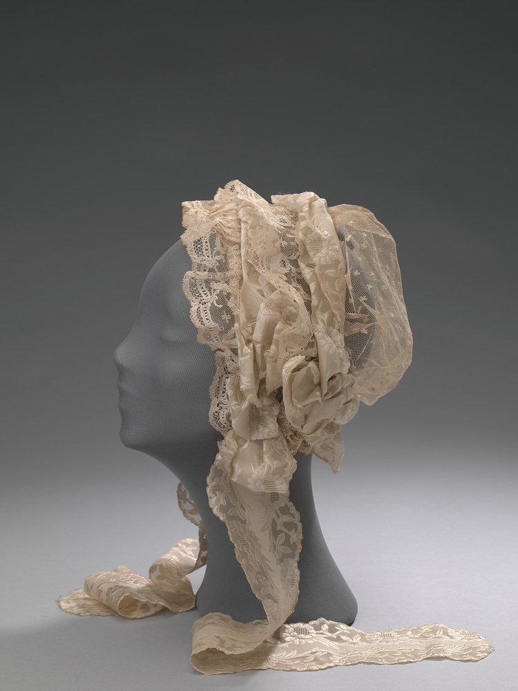 Crèmekleurige huismuts gemaakt van handgeklost kant (modieus Rijsselse kant) afgewisseld met linten.