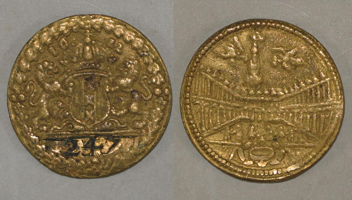 voorzijde: gekroond wapenschild van Amsterdam, geflankeerd door twee leeuwen onder het jaartal 1612; onder de afsnede een nummer. De rand is voorzien van een palmkrans.
