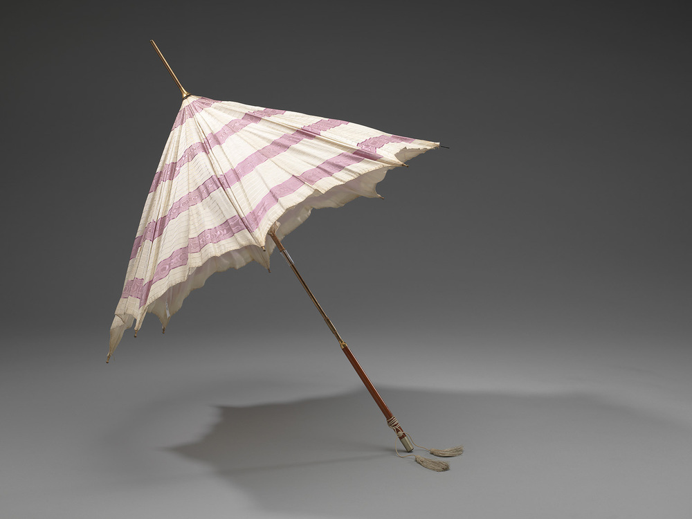 Parasol, met metalen inschuifbare steel, met houten handvast met metalen ring en beige kwast. Het dek is van cremekleurige zijde met smal ingeweven ribstreepje en ingeweven roze (lila) moiré streep, die het aanblik geven van opgenaaid lint. Voering van cremekleurige zijde. Op het dek een lange metalen punt. Spaken van metaal en uitlopend in metalen knoppen. De steel heeft vlak boven het handvat een schuif, de steel kon bij het handvast omgeklapt worden. Geen gebruikelijk systeem.