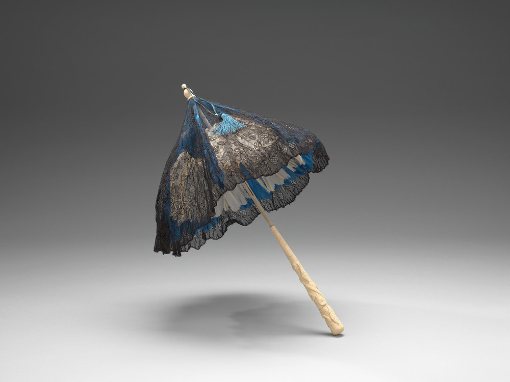 Parasol, met houten en ivoren steel, waarvan het onderste gedeelte bewerkt is in de vorm van een boomstam, knoesten en slang en aan de onderkant een bloem ('boom van goed en kwaad'). Zwart kanten dek (machinaal gebreide kant) op blauwe zijde met geschulpte rand. Voering van crèmekleurige zijde met geschulpte rand met ingestanste bloemmotieven, Op het dek een ivoren knop, met een blauwe zijden kwast. Spaken van ijzer.
