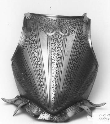 In de jaren zeventig van de zestiende eeuw bestelde de Amsterdamse schutterij vele harnassen in Noord-Italië. Dit exemplaar is waarschijnlijk vervaardigd in Brescia. Het is een zogenaamd pronkharnas, bestaande uit tien verschillende onderdelen om alle delen van het lichaam te beschermen. De harnassen werden gedragen door de infanterie van de schutterij: militairen te voet. Zij moesten de stadsmuren en –poorten beschermen en orde handhaven in Amsterdam. Tijdens de jaarlijkse kermis in september toonden de schutters zich in volle, glanzende wapenrusting aan de stad. Naarmate de kracht van vuurwapens sterker werd, werd het harnas geleidelijk aan meer een statussymbool dan bescherming. ( Sarah Remmerts de Vries)