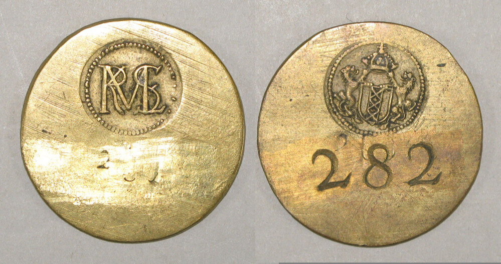 voorzijde: stempel in cirkelvorm met parelcirkel, waarin afgebeeld het gekroonde wapen van Amsterdam, geflankeerd door twee leeuwen, boven het gegraveerde nummer 282. keerzijde: cirkelvormig stempel met monogram MKRLS in parelcirkel.- Trefwoorden