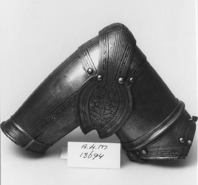 Pronkharnas samengesteld uit een borst- en rugstuk, dijstukken met links tien en rechts twaalf geledingen, schouder- en armstukken, helm en halskraag. De schouderstukken bestaan elk uit zes geledingen. Het harnas is rijk beëtst, waarbij nauwelijks ruimte onbenut is gelaten. Alle onderdelen zijn langs de randen lijn- of kabelvormig geciseleerd. De velden zijn gedecoreerd met verticale, de vorm van het harnas volgende, banden met diverse trofee- en fantasiemotieven en zijn aan weerszijden afgezet met kabelciselering. Op het borststuk ter hoogte van het sleutelbeen en pop het schouderstuk alsmede op de dijstukken zijn twee medaillons aangebracht van een alkaar aankijkende man- en vrouwportret. Daarnaast zijn op de voor- en achterzijde van het schouderstuk twee cartouches zichtbaar. Dit is, op de voorzijde, één met een ridder met sponton en één met een ridder met een bol vorrwerp in handen. Op de achterzijde is dit één met een ridder in gevecht met een naakte figuur en één met een vrouw met een urn. Alle delen zijn met riempjes aan elkaar verbonden. Deze riempjes bevatten rozetvormige klinknagels. Gedecoreerd met biezen en “mops and brooms”. Het rugstuk met zwikvulling ranken putto.