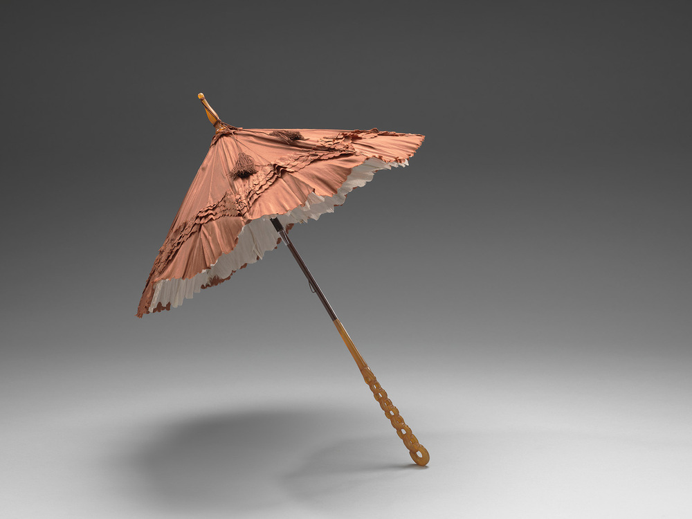 De parasol past in de mode rond 1870-1880, met veel ruches, randen en schulpen. Modieuze parasol.